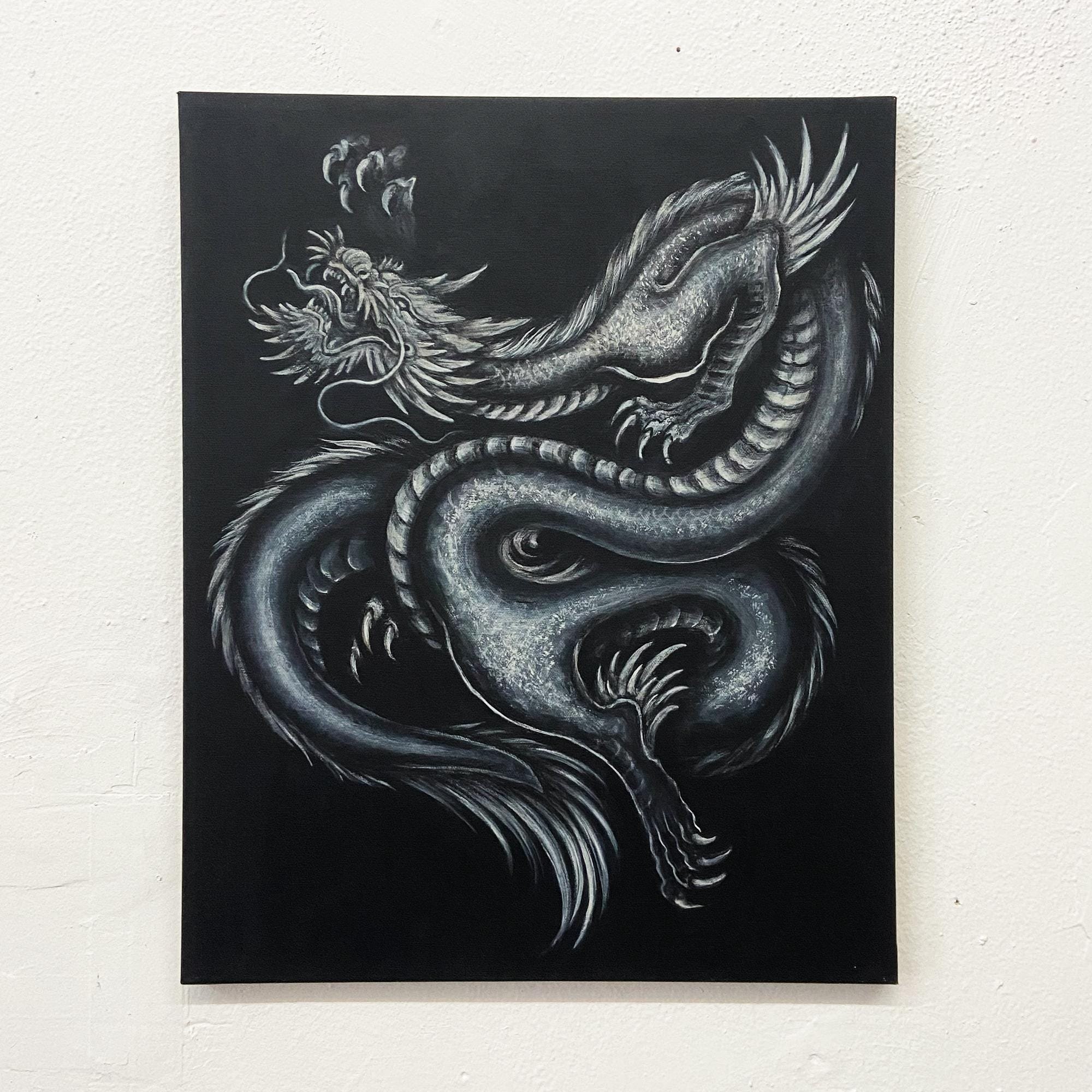 This original acrylic painting features a powerful Chinese dragon, rendered in smoky grey tones against a deep black background. In Chinese culture, the dragon symbolizes strength, protection, wisdom, and good fortune—a guardian spirit believed to bring harmony and prosperity.