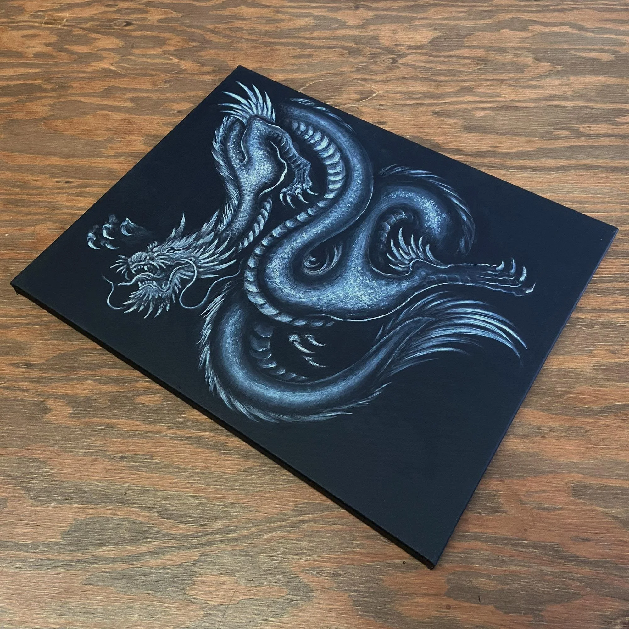 This original acrylic painting features a powerful Chinese dragon, rendered in smoky grey tones against a deep black background. In Chinese culture, the dragon symbolizes strength, protection, wisdom, and good fortune—a guardian spirit believed to bring harmony and prosperity.