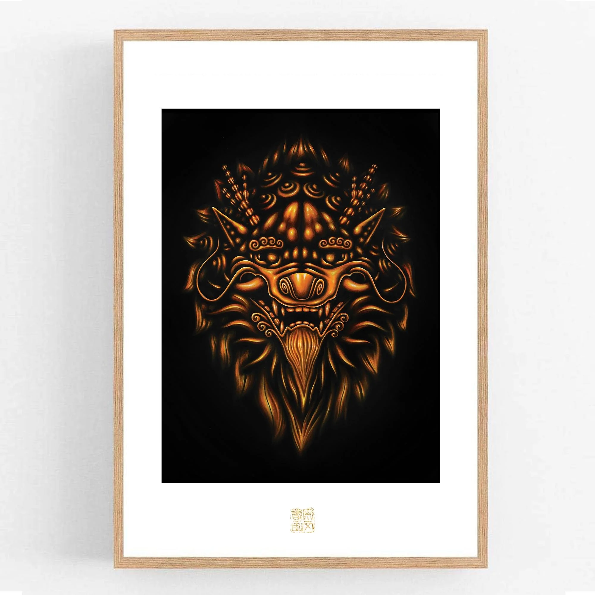 The painting depicts a fierce gold Chinese dragon face, radiating strength and authority. Set against a deep black background, it resembles an imperial emblem, symbolizing protection and power. The intricate details and intense expression capture the essence of this mythical guardian.