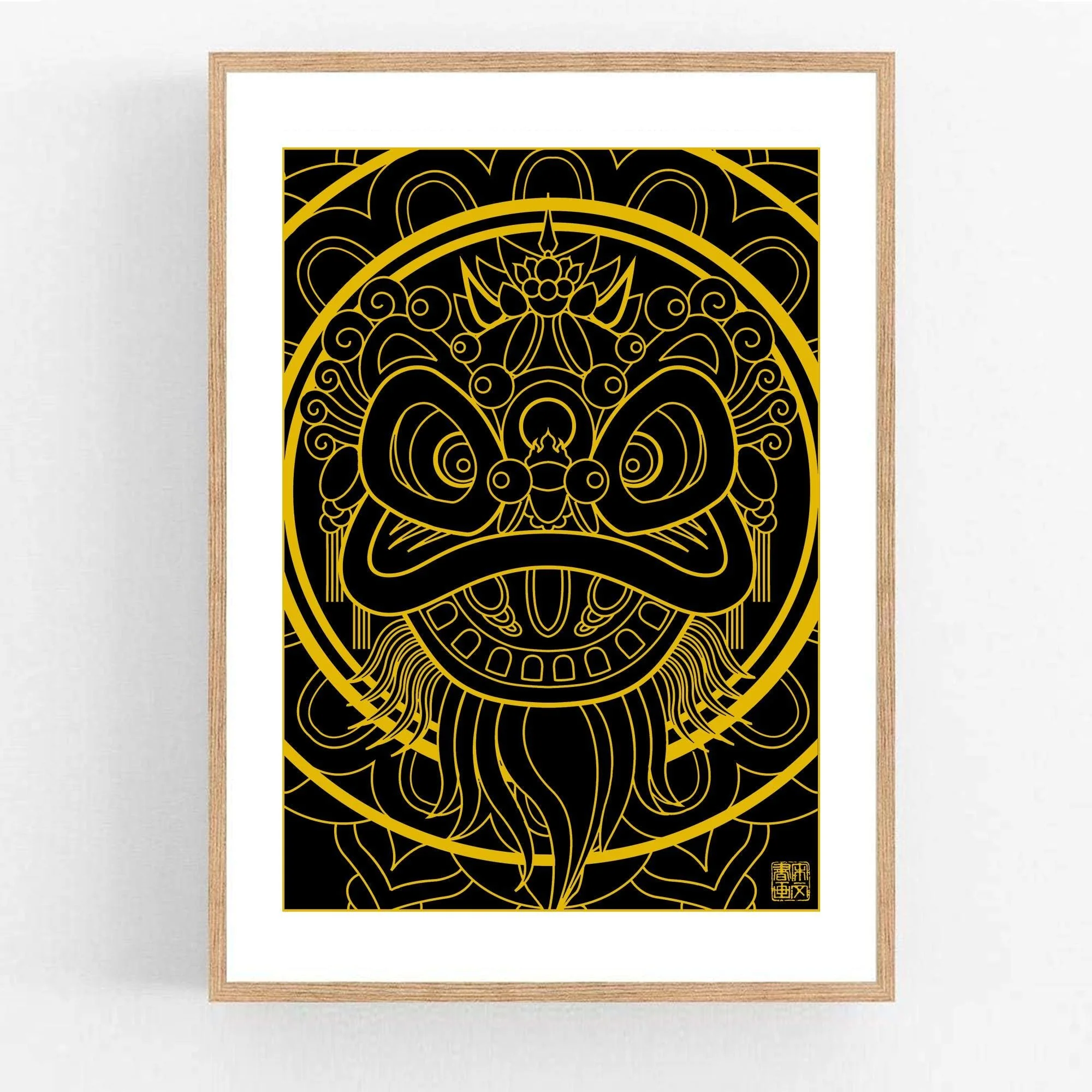 Gold Chinese Lion Head Line Drawing Archival Matte Paper Print