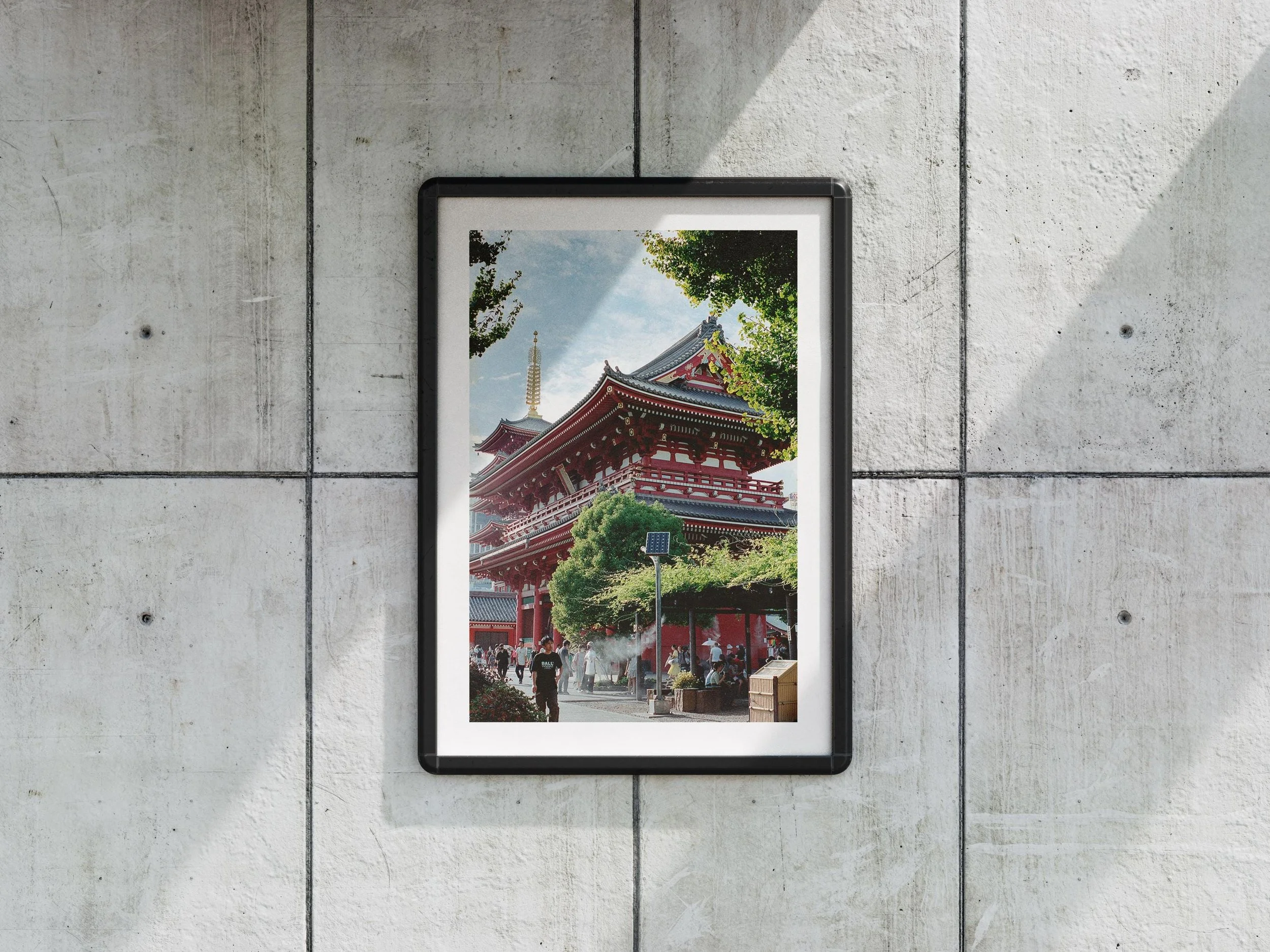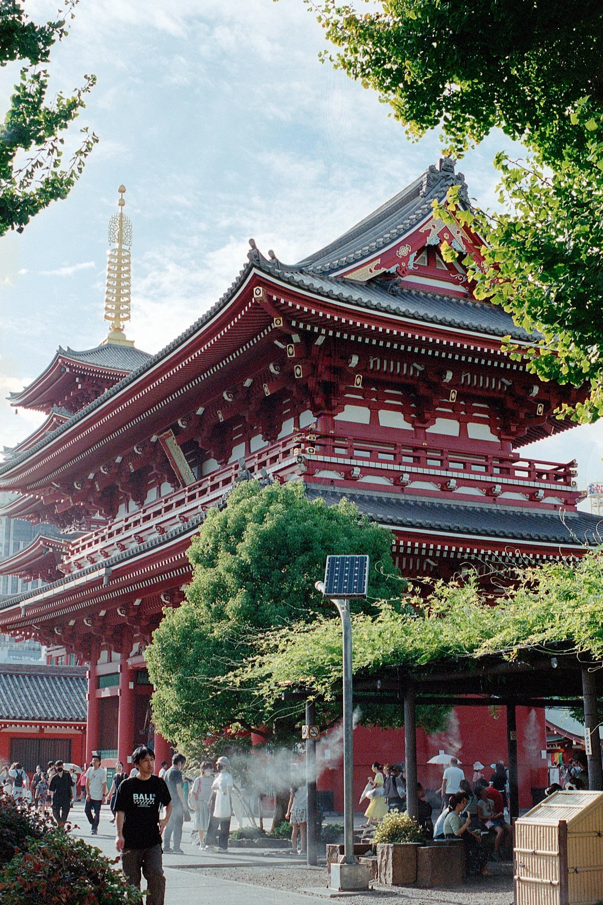 DESCRIPTION This photo taken on 35mm film captures the beauty and culture of Japan. This photo of Senso-Ji in Asakusa showcases the intricate construction of the temple, framed with the surrounding foliage.