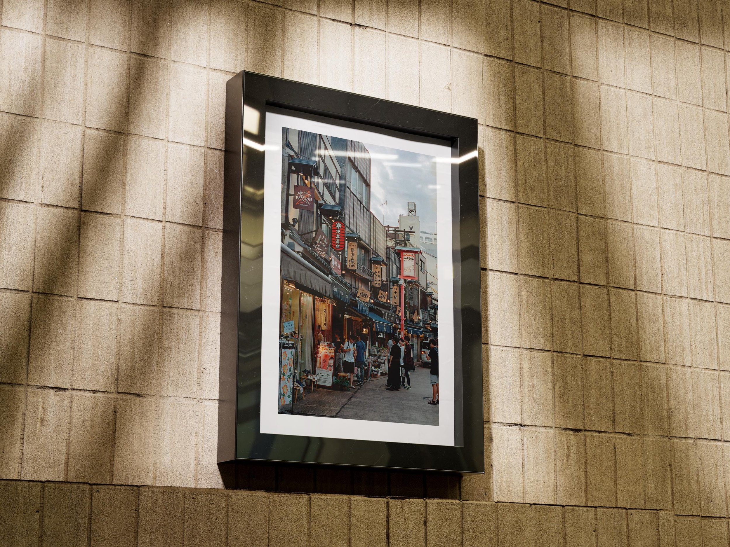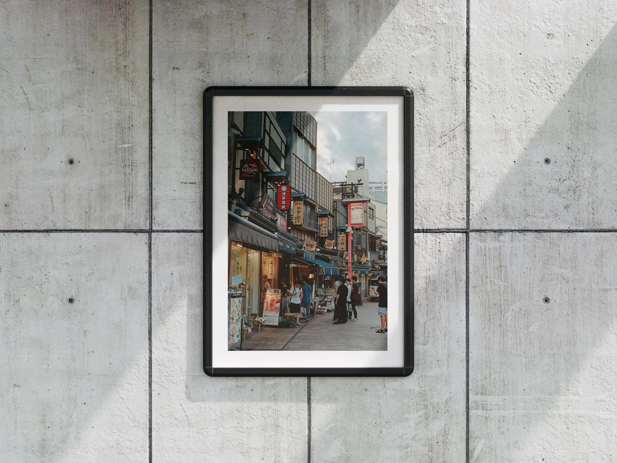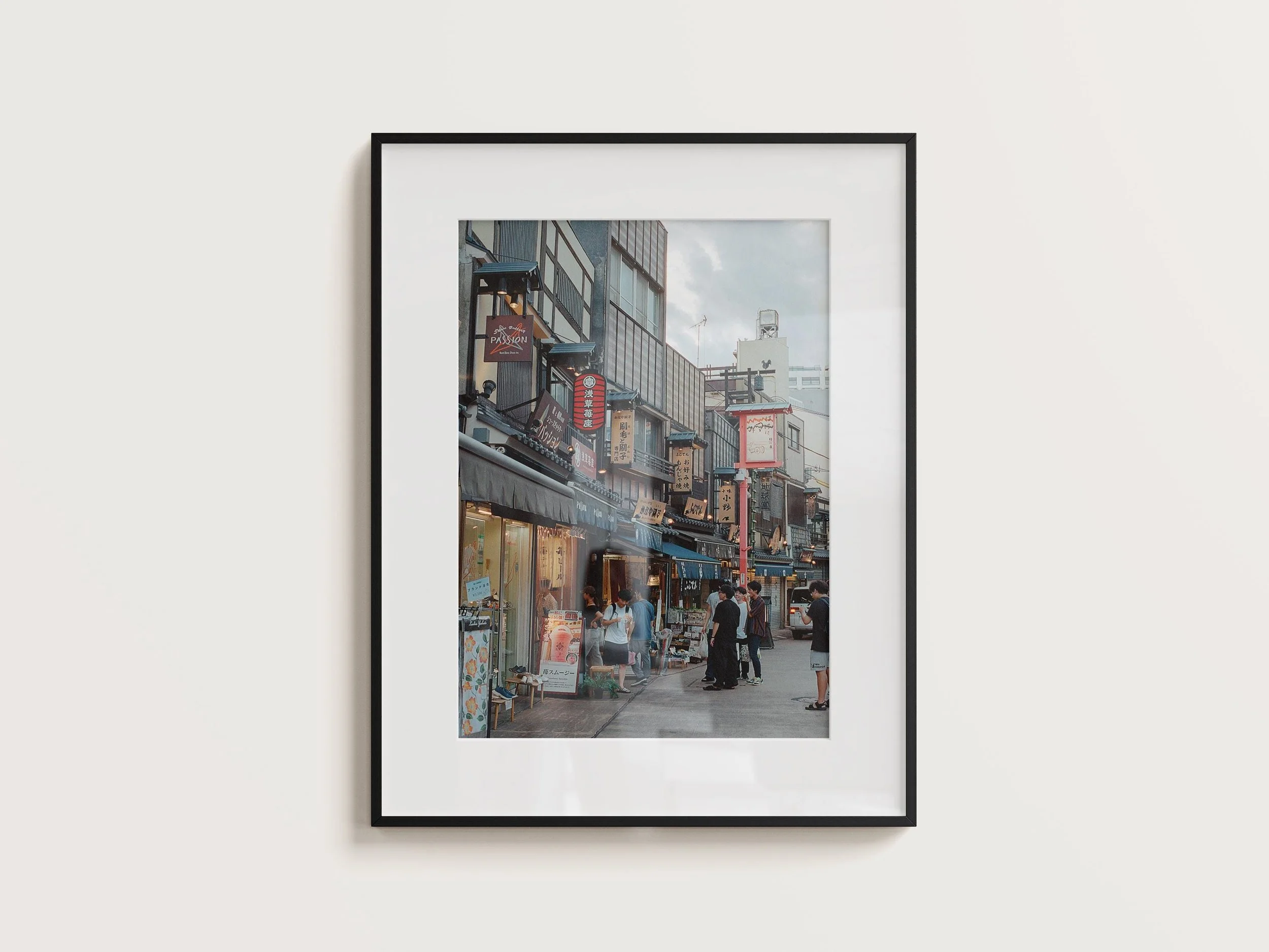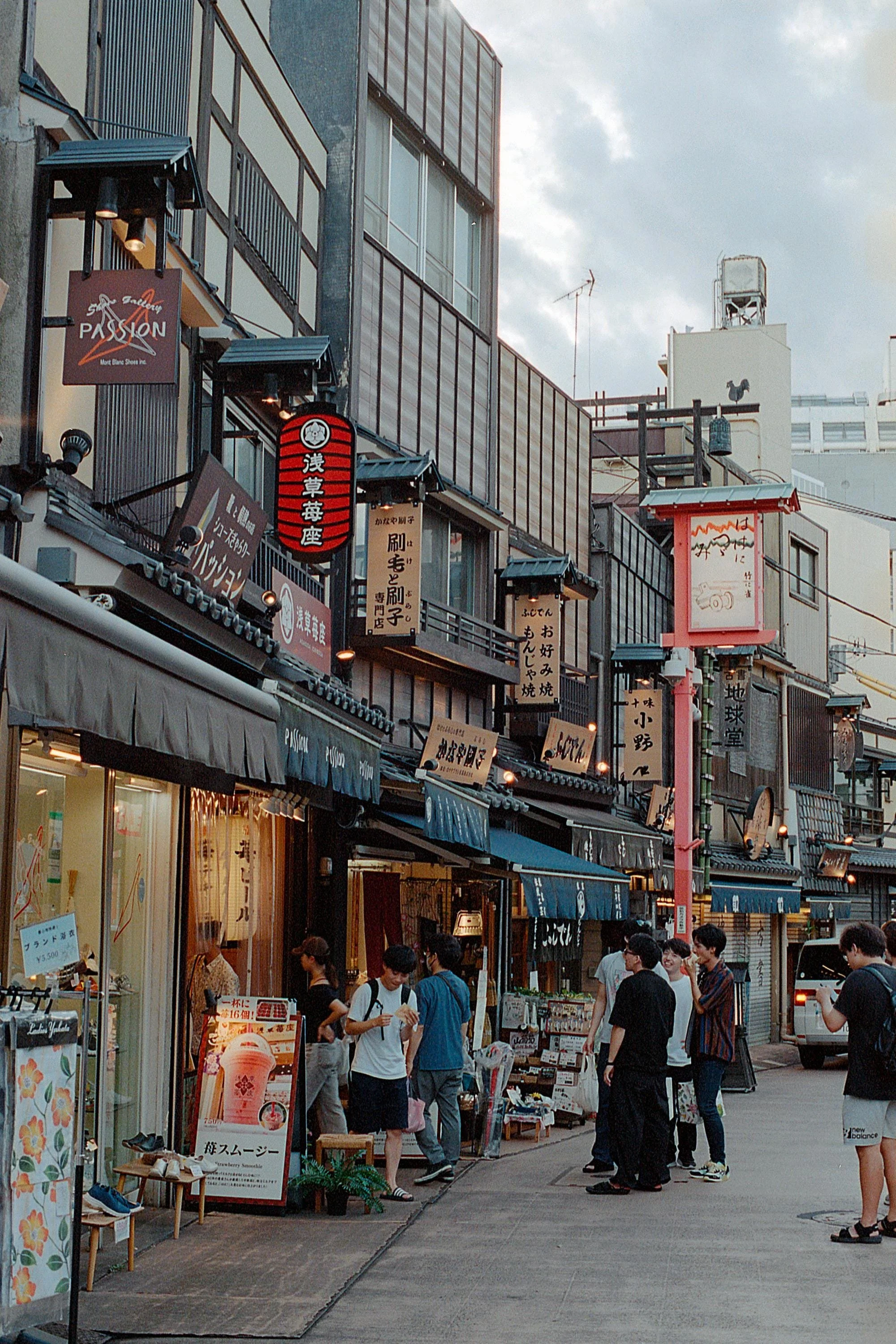 DESCRIPTION This photo taken on 35mm film captures the beauty and culture of Japan. This photo shows a row of shops with beautifully designed traditional signs.