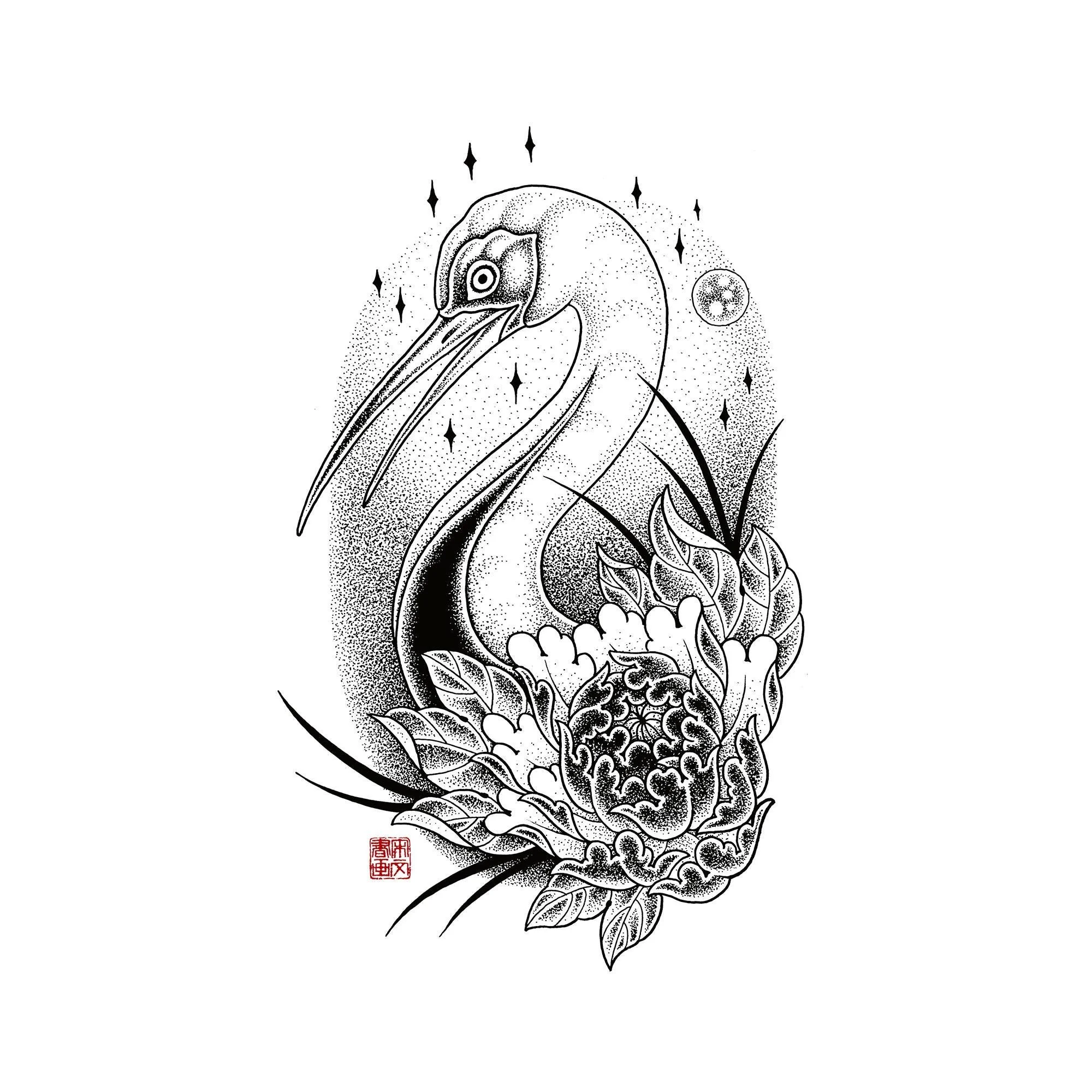 Japanese Crane and Peony Celestial Stipple Ink Drawing Archival Matte Paper Print
