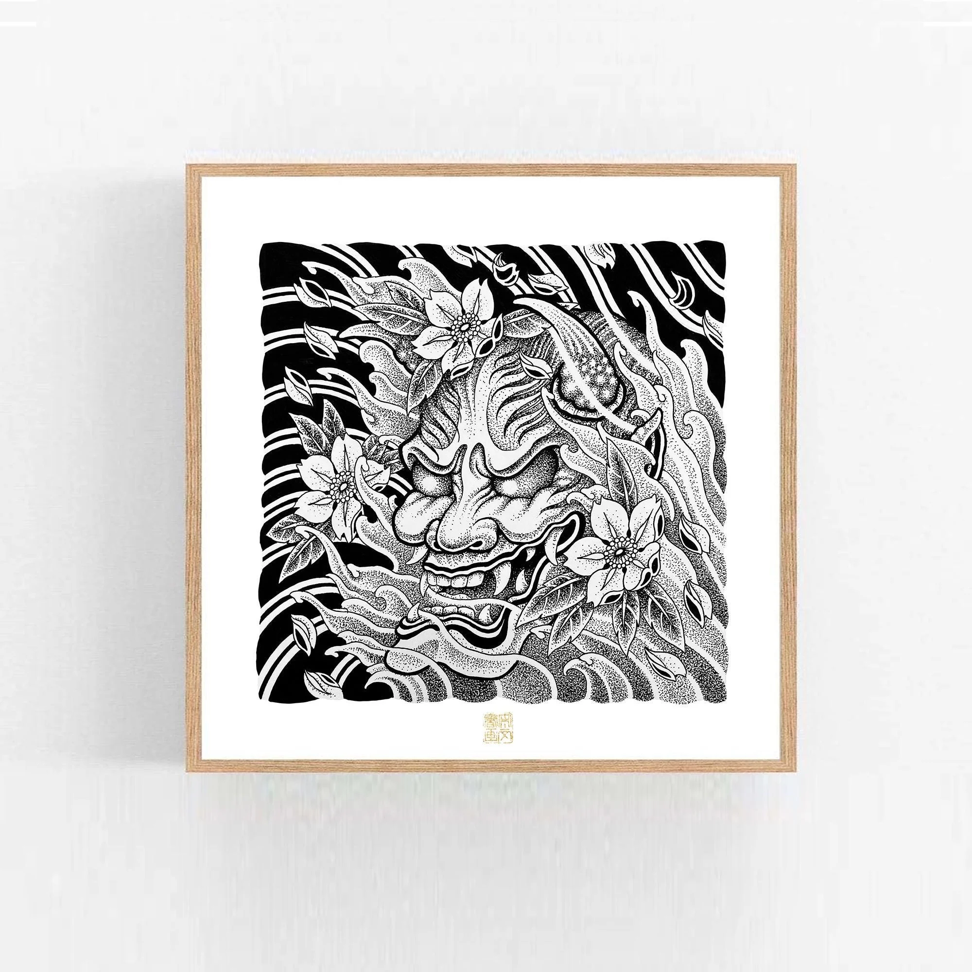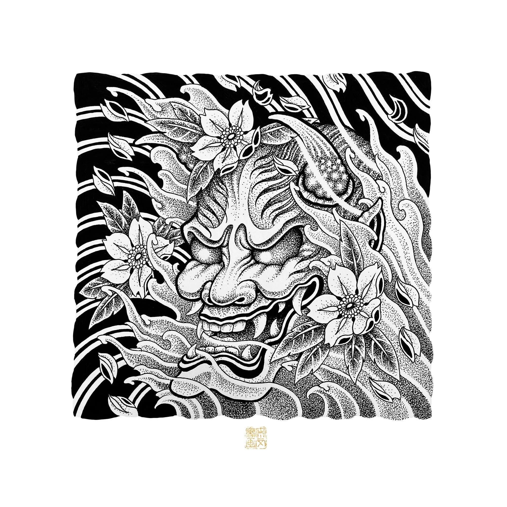 This stipple ink drawing showcases a fierce Japanese oni mask, intricately entwined with flowing waves and delicate cherry blossoms. The meticulous dot work brings texture and depth to the mask's menacing expression, while the blossoms add a gentle, contrasting softness. Together, the elements create a dynamic interplay of strength and beauty, symbolizing the balance of nature and mythology in Japanese culture.