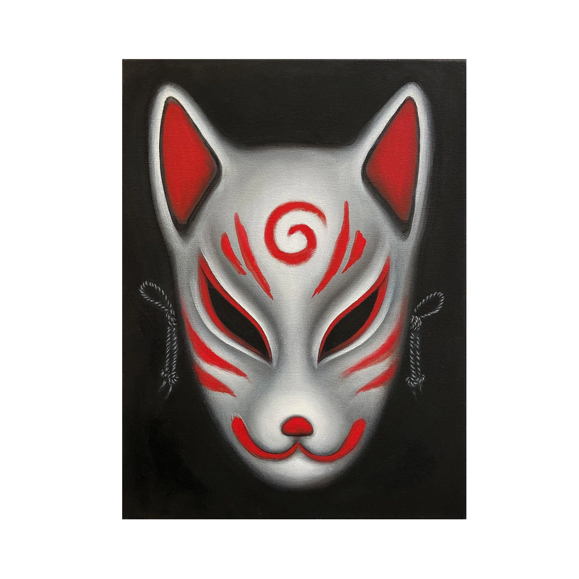 The painting features a traditional Japanese Kitsune mask, elegantly crafted with intricate details and vibrant colors. In Japanese folklore, the kitsune is a fox spirit known for its intelligence and magical abilities, often associated with the deity Inari and symbolizing protection and prosperity. This mask captures the kitsune's playful yet mysterious nature, representing the balance between mischief and guardianship.