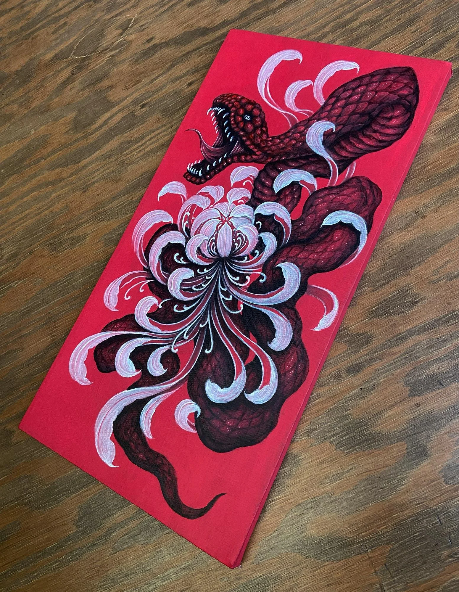 Red Snake and Chrysanthemum Acrylic on Canvas Original Painting