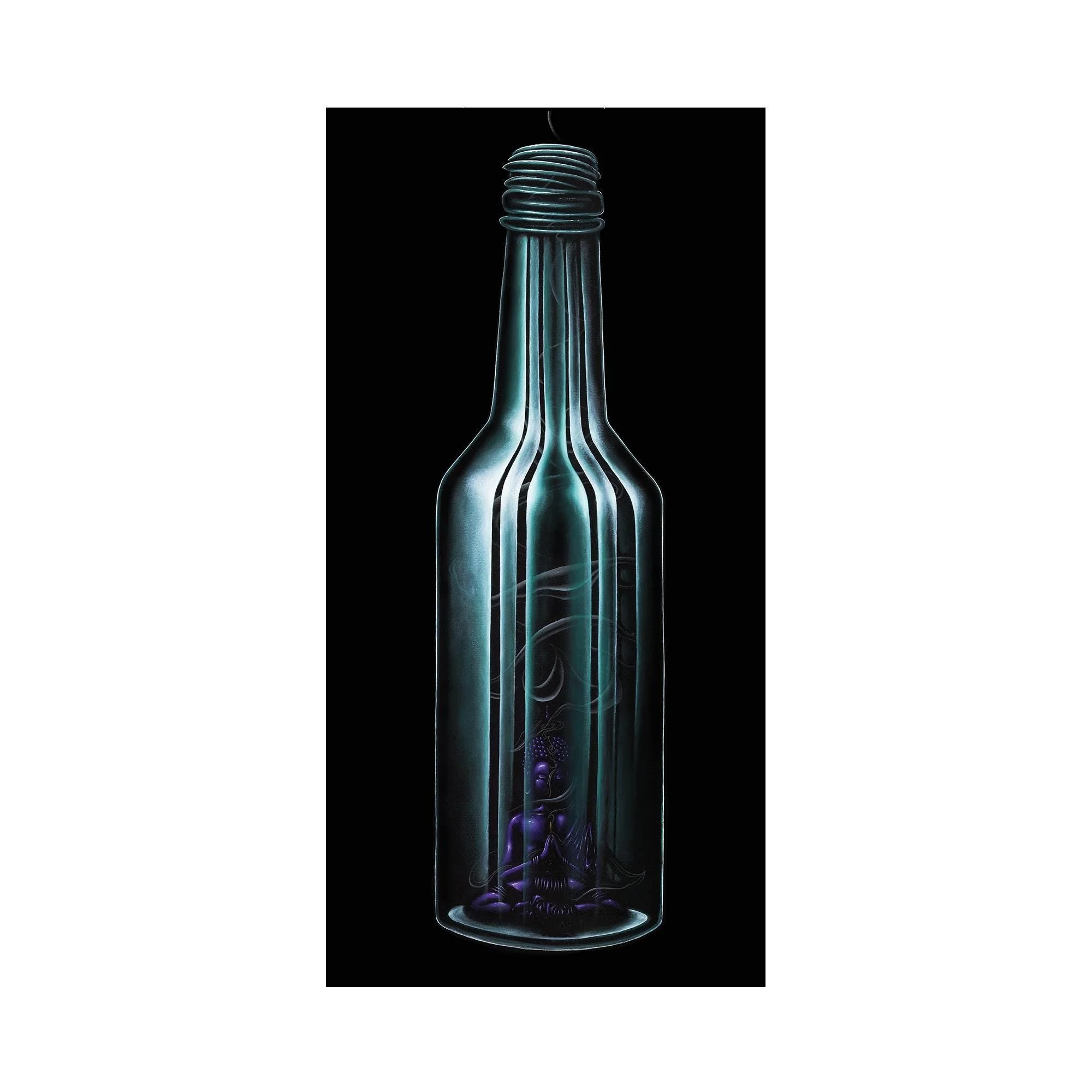 Nestled within an empty wine bottle, a tranquil purple Buddha sits in meditation, cradling incense that gently burns, symbolizing the enduring spirit of life. His healing energy contrasts with the bottle’s emptiness, sometimes, true peace is found at the bottom of the bottle. The scene invites reflection on balance, healing, and the warmth of serenity amidst stillness